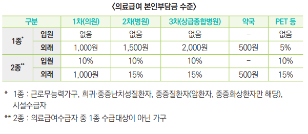 - 1종 : 근로 무능력 가구, 희귀·중증 난치성 질환자, 중증질환자(암 환자, 중증화상환자만 해당), 시설수급자