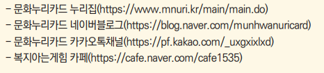 - 문화누리카드 누리집과 SNS채널, 복지아는게힘 카페에서 확인하실 수 있습니다.