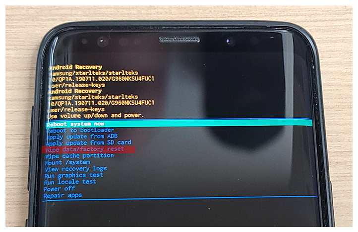• 화면에서 Wipe data factory reset을 찾은 후 선택 합니다. 참고로 메뉴 이동은 볼륨 버튼, 메뉴 선택은 전원 버튼을 사용하시면 됩니다.