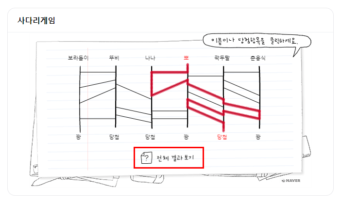 2) 사다리가 생성되는것을 볼 수 있으며, 전체결과 및 다시하기를 통해 결과를 확인할 수 있습니다.
