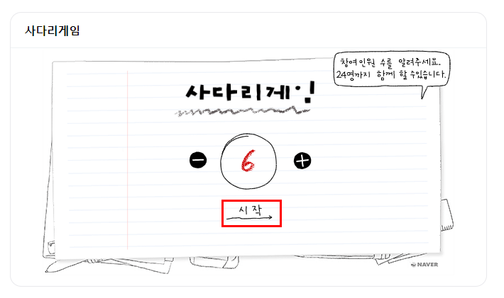 영어로 Ghost Leg라고도 하는 사다리타기 게임은 점심내기, 간식내기, 청소 등을 할때 많이 사용이 되는 게임으로, 인원수 만큼 세로줄을 그은 후 한쪽에는 이름을 쓰고 한쪽에는 상품이나 벌칙을 쓴 뒤 세로줄 사이사이에 가로줄을 그어 아래로 내려가며 결과를 얻는 게임입니다. 네이버 사다리타기 게임은 국내에서 가장 많이 활용되는 사다리타기 게임으로, 최대 24명까지 참여할 수 있다는 특징이 있습니다.