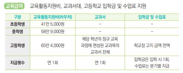 1) 구분 / 교육활동 지원비(바우처) / 교과서 입학금 및 수업료