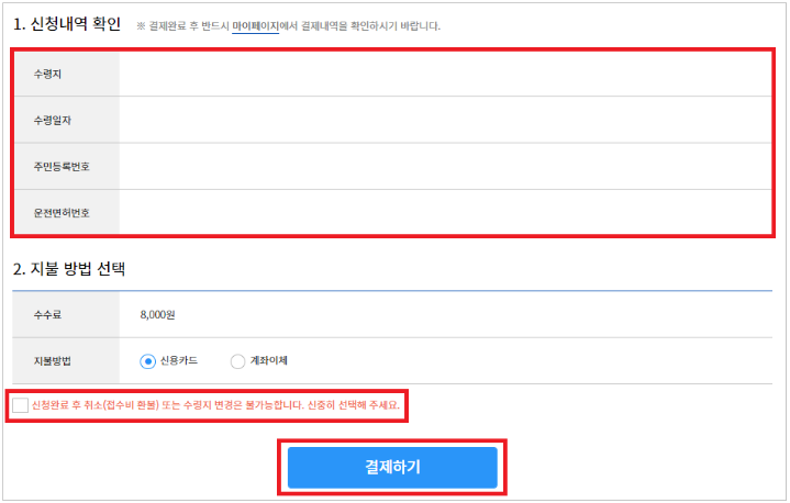 7) 최종 신청 내역을 확인한 뒤, 지불방법을 선택 해 결제합니다. (*수수료: 8,000원)