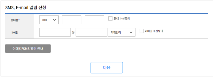 5) 휴대폰 전화번호 및 이메일을 입력한 뒤 알림설정을 합니다.