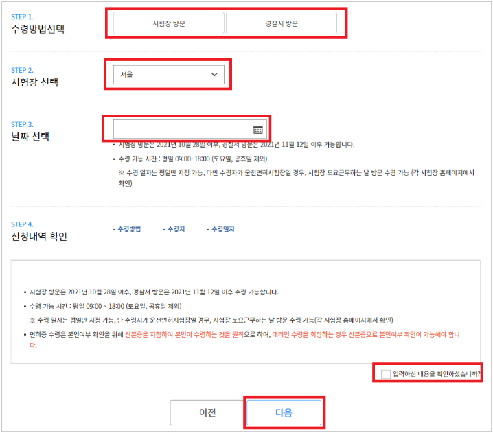 4) 수령방법 및 원하는 시험장, 혹은 경찰서를 직접 선택한 뒤 날짜를 지정합니다.