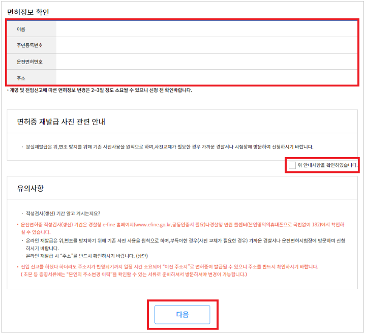 - 재발급 시 새로운 면허번호가 부여됨으로 기존 면허증은 사용할 수 없습니다.