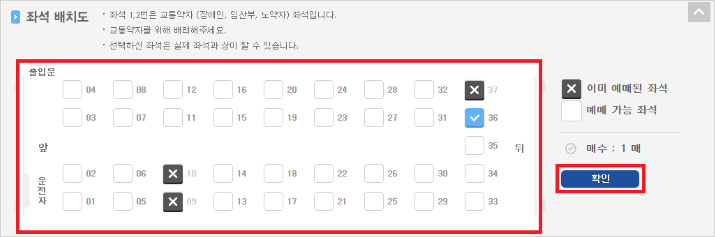 7) 좌석 배치도에서 좌석을 체크한 뒤 확인을 클릭합니다.