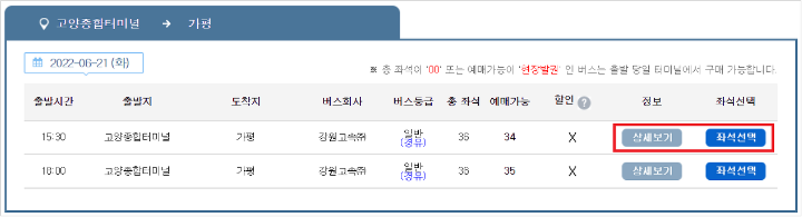 6) 출발시간 확인 후 좌석선택을 클릭합니다.