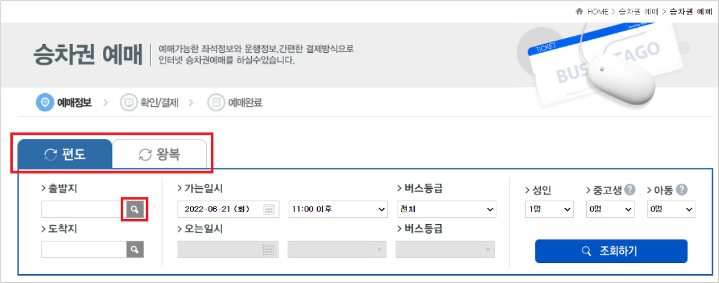 5) 출발 일시와 시간, 버스등급등을 선택하고 조회하기를 클릭합니다.