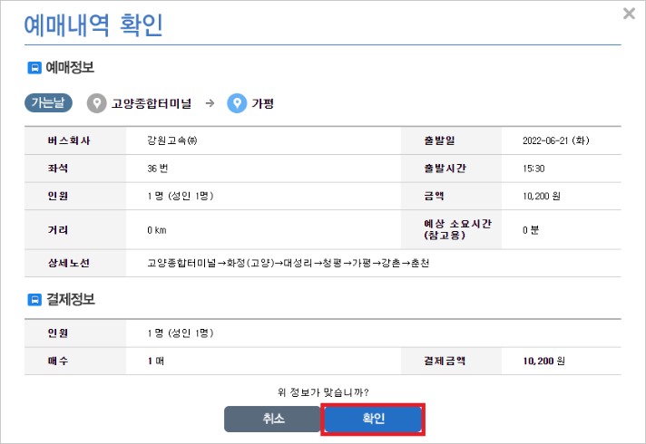 8) 예매내역을 다시 한 번 확인한 후 확인 버튼을 클릭하면 승차권 예매가 완료됩니다.