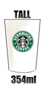 스타벅스 컵 사이즈의 기본이 되는 음료 사이즈로, 톨 사이즈의 크기는 355ml(12oz) 입니다. 가장 기본이 되는 사이즈인만큼 주문 시 톨 사이즈로 주문을 할 것인지 묻는 경우가 많기 때문에, 톨은 기본 사이즈이기 때문에 음료를 더 드시고 싶다면 그란데 사이즈나 벤티 사이즈를 드시는 것을 추천드립니다.