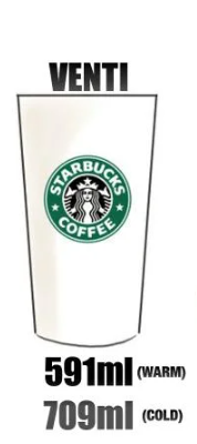 벤티는 이탈리아어로 숫자 20을 나타내며, 20oz를 의미합니다. 벤티 사이즈의 크기는 591ml(20oz) 입니다. 톨 사이즈와 비교하면 약 2배에 달하는 크기로, 벤티 사이즈로 커피를 즐겨드신다면 커피나 음료를 매우 좋아하실 확률이 높습니다.