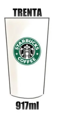 트렌타는 이탈리아어로 숫자 30을 나타내며, 30oz를 의미합니다. 트렌타 사이즈의 크기는 887ml(30oz) 입니다. 거의 1L에 달하는 대용량 사이즈로 인해 스타벅스 코리아에서 판매되는 음료는 하단의 3가지로 제한되어 있으며, 트렌타 사이즈의 음료는 매장 내 섭취가 불가능하며 테이크 아웃을 통해서만 판매가 되고 있습니다.