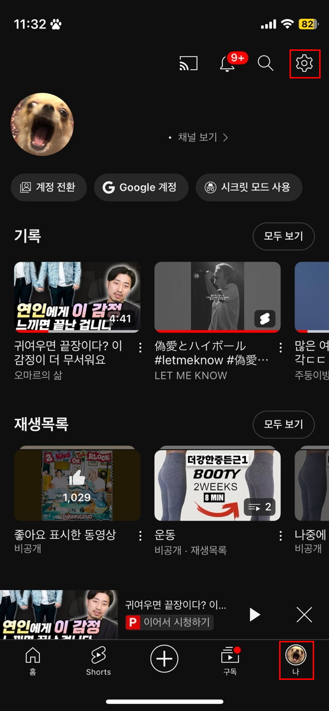 2) 유튜브 앱 우측 하단 내 프로필을 클릭한 뒤, 우측 상단의 톱니바퀴 모양 아이콘을 클릭합니다.