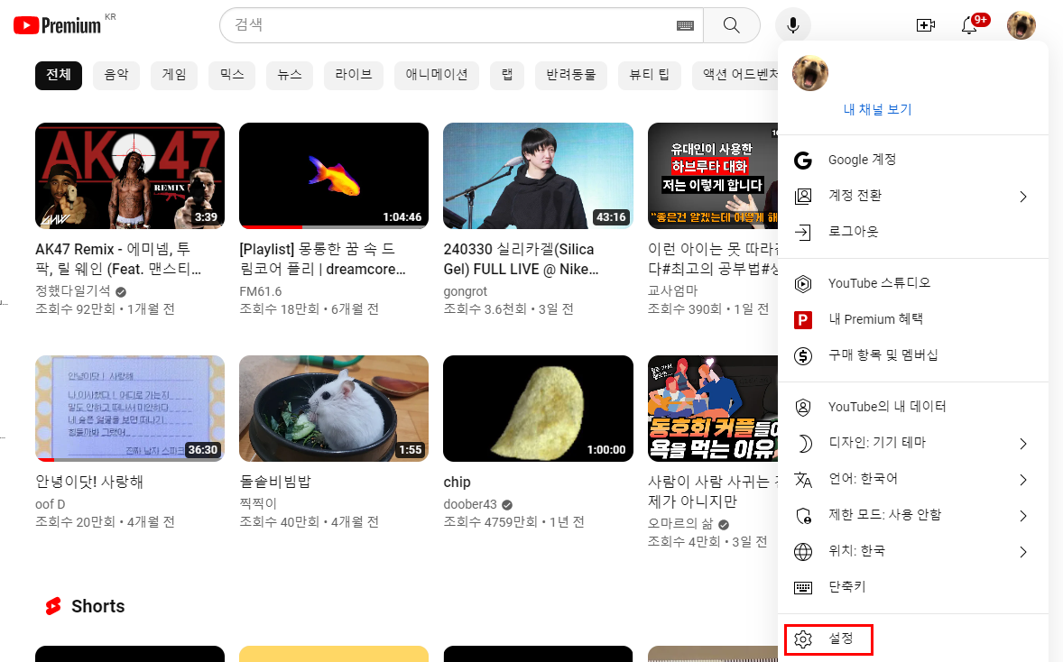 1) 우측 상단 내 프로필 클릭 후 설정을 클릭합니다.