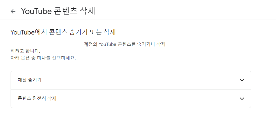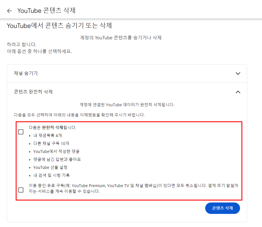 3) 본인인증을 한 뒤 다음을 클릭하시면 유튜브 콘텐츠 삭제 화면이 뜹니다.