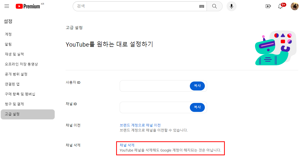 2) 좌측 하단 고급 설정을 클릭 후 채널 삭제 버튼을 클릭합니다.