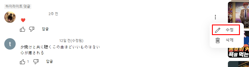 5) 댓글을 수정하고 싶다면 해당 댓글 링크부분을 클릭 후, 연결 된 동영상 페이지에서 내 댓글 우측에 있는 점 세개 아이콘을 누른 후 수정 버튼을 통해 댓글 수정이 가능합니다.