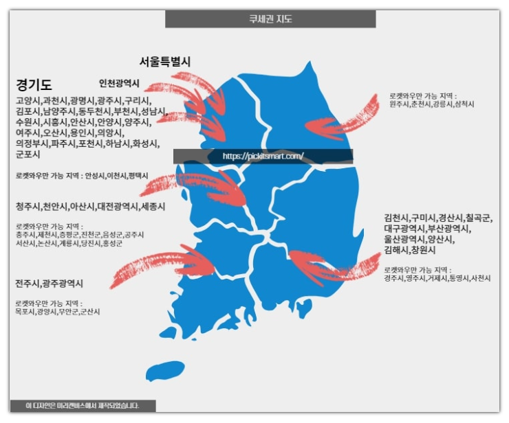 ※ 새벽배송이나 로켓배송 불가지역은 경기도 연천군만 해당이 되며 나머지 강원도, 충청북도, 충청남도, 전라북도, 전라남도, 경상북도, 경상남도, 제주도 등은 많은 지역에서 배송이 불가능 합니다.