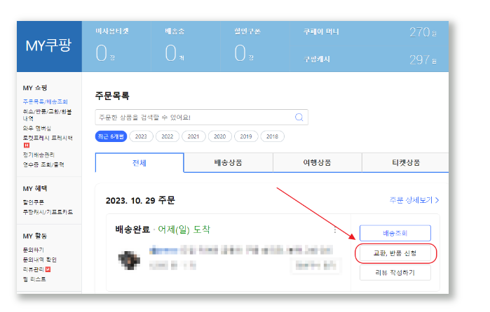 마이쿠팡 > 주문목록 페이지 접속 후 "교환, 반품 신청"을 클릭하면 기사님이 직접 방문수거를 하신 후 환불이 이 완료됩니다.