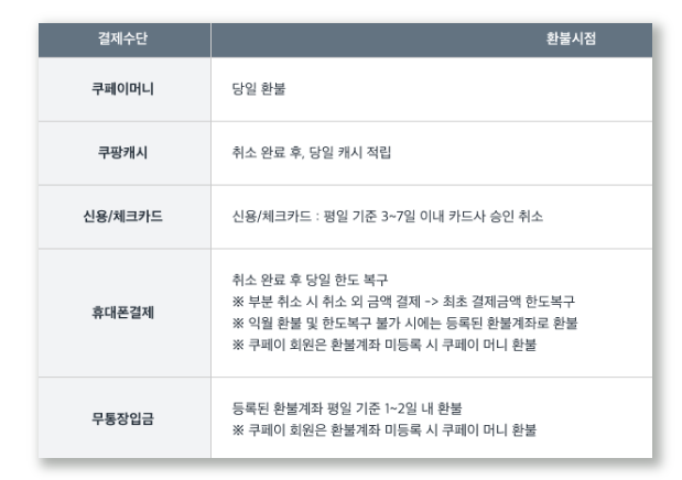 환불이 완료되는 기간은 결제수단에 따라 달라지며, 하단과 같습니다.