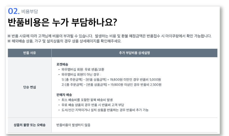 환불 비용도 크게 두 가지로 나뉘며, 로켓 와우 회원의 경우 환불 시 따로 비용이 청구되지 않습니다.