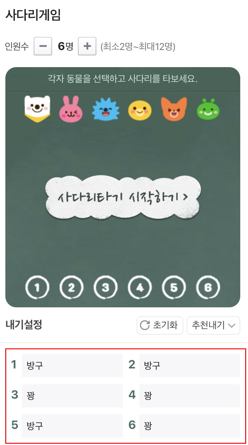 1) 인원수를 2명 ~ 12명까지 선택한 후 내기를 설정한 뒤 시작하기를 클릭합니다. 참고로 모바일에서는 최대 12명, PC에서는 최대 24명까지 참여가 가능합니다.