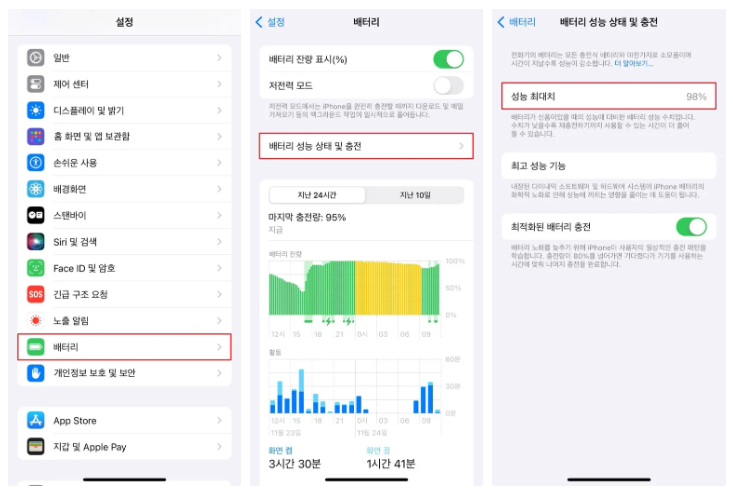 아이폰 배터리 교체시기에 대한 객관적인 지표는 먼저 배터리 성능을 확인하는 것입니다. 아이폰 설정 앱 > 배터리 > 배터리 선을 상태 및 충전으로 들어가 성능 최대치를 확인하여 80% 이하로 내려갔을때 아이폰 배터리 교체를 추천드립니다. 배터리 수명은 사용시간과 관련이 있기 때문에 배터리의 성능이 80% 이하로 떨어졌을 때 배터리를 교체하시는 것을 추천드립니다.